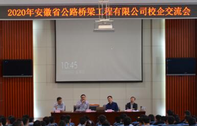 开学第一课之后,安徽省道路桥梁工程有限公司总经理助理沈壮、团委书记曹勇应邀来到会场开展2020年土木工程系秋季首场校企交流会。沈总向在做的师生详细的介绍了安徽路桥公司的发展历程、企业现状、在建项目与规模、职业发展通道、福利待遇等情况,他勉励同学们奋发读书、勇攀路桥专业知识高峰,同时也欢迎同学们毕业后加入安徽路桥公司大家庭。