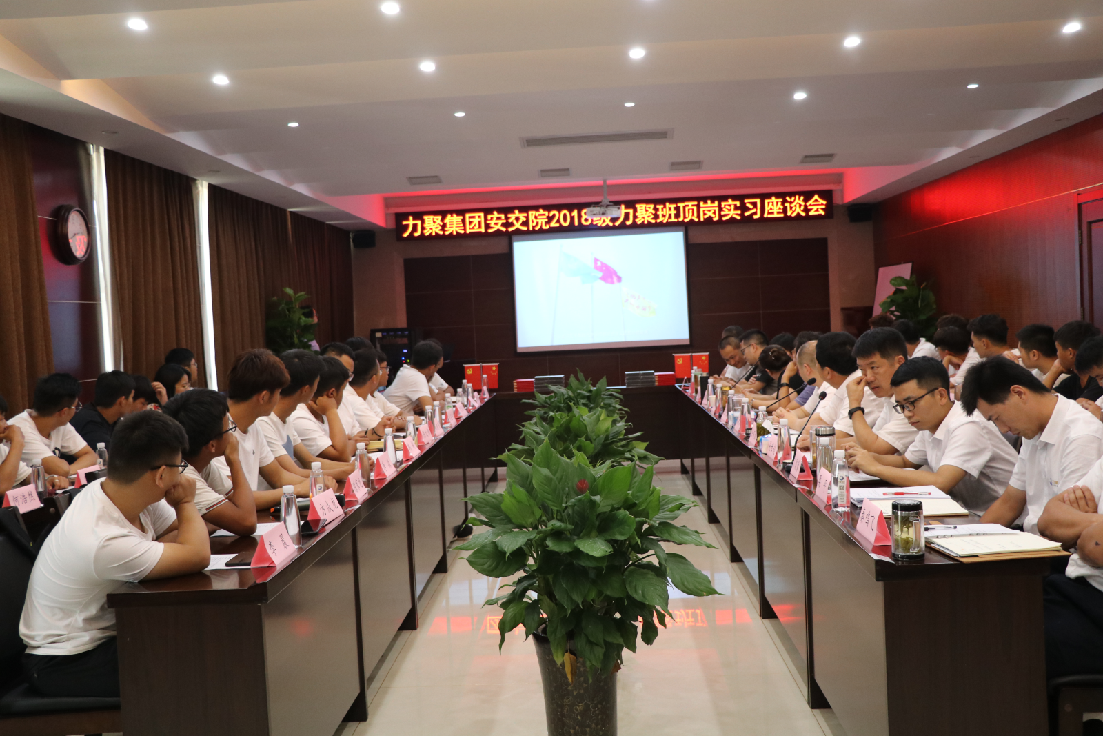 8月28日下午我系副主任王守胜带队,系校企合作办公室主任周滔、及18、19力聚班辅导员王佳宾、韩彰主任一行人赴力聚集团举行“力聚班”顶岗实习座谈会,会议由力聚集团党总支书记陈邦勤主持,力聚集团董事长宋执寿、纪监委主任吴世超及2018级“力聚班”学生参加了本次会议。