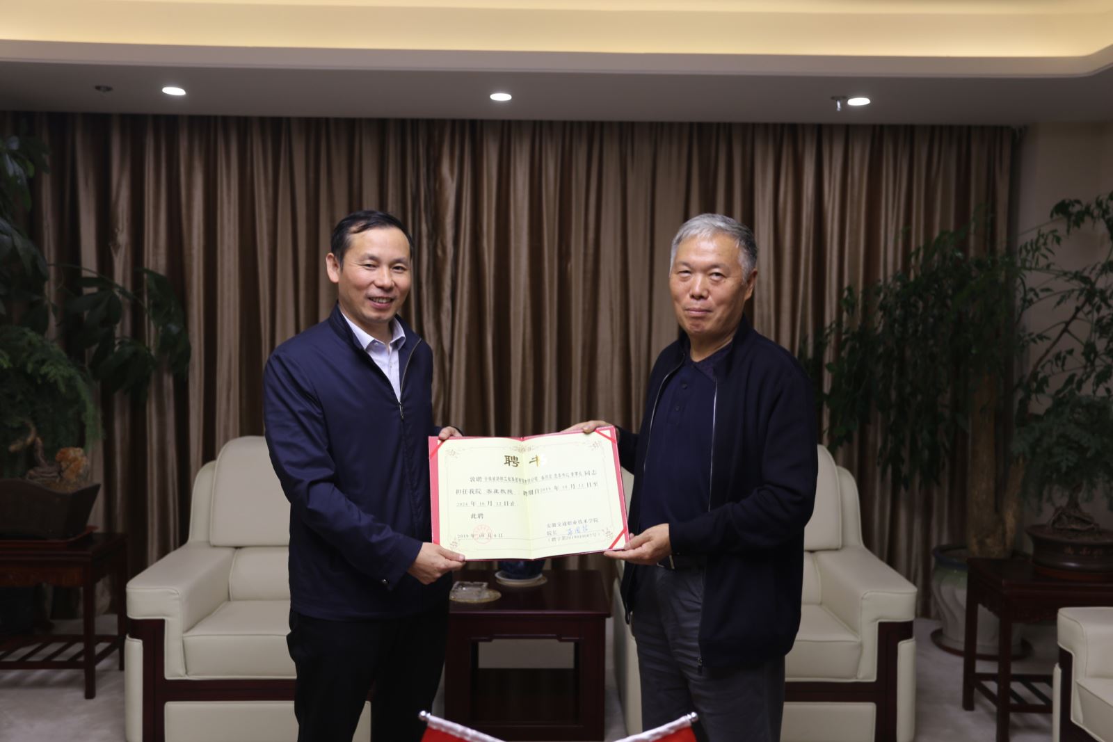 张国栋和王丰胜分别向盛明宏、欧阳志宜、王家林颁发学院客座教授聘书。