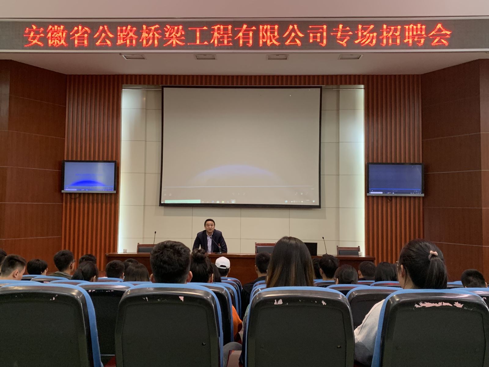 10月31日下午,安徽省公路桥梁工程有限公司在院北区学术报告厅举行专场招聘会,公司人力资源部部长沈壮一行、我系主任王常才和党总支副书记朱蓉出席了会议。我系17级路桥、检测、造价、轨道交通以及部分物流、机械专业近百名毕业生到场应聘。我系18级检测和轨道专业学生也来到现场观摩。王常才主任主持了会议。