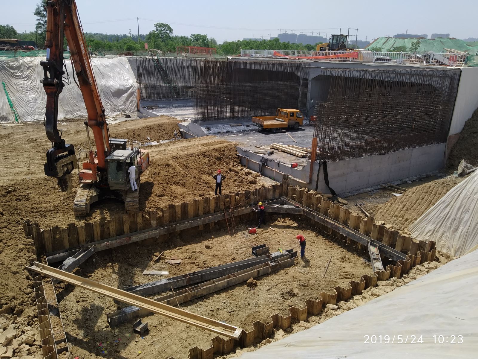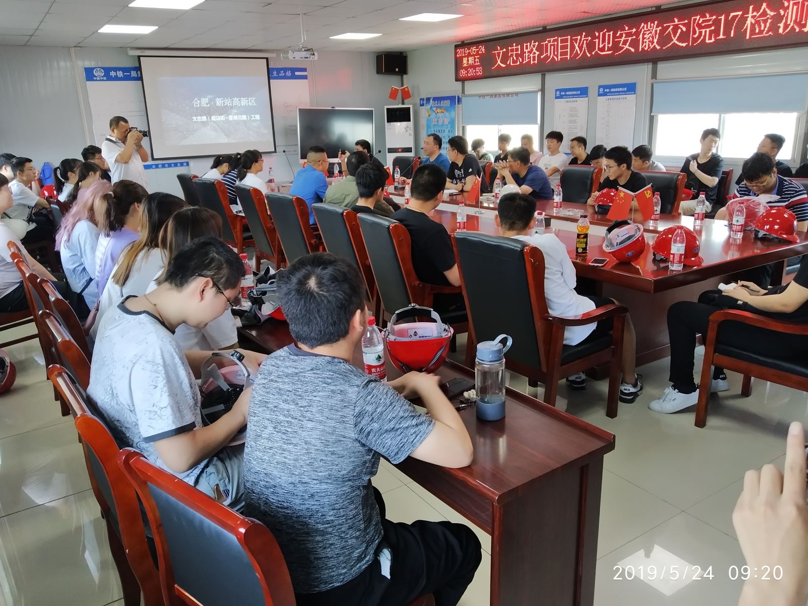 5月24日上午,17131班的同学们在实习指导老师叶生老师和吴跃梓老师带领下,来到了文忠路(磨店街-荃湖北路)工程项目部,项目总工王总详细介绍了工程情况:工程全长2.3km,总造价6.56亿元;主要工程有道路、排水、下穿隧道、人行天桥、跨线桥、标志标线、智能交通土建、照明、供电土建等;工程重难点:下穿少荃湖隧道施工。少荃湖水深约6.5m,采用围堰明挖法放坡施工,最大开挖深度约16m,开挖顶宽约95m,底宽40.9m,隧道外包尺寸为8.9m高×36.9m宽,为单箱双孔钢筋砼框架结构。会上还播放了工程航拍视频,根据视频播放进度,王总详细介绍了各个施工部位的重点和难点,采用的主要施工方法和措施。