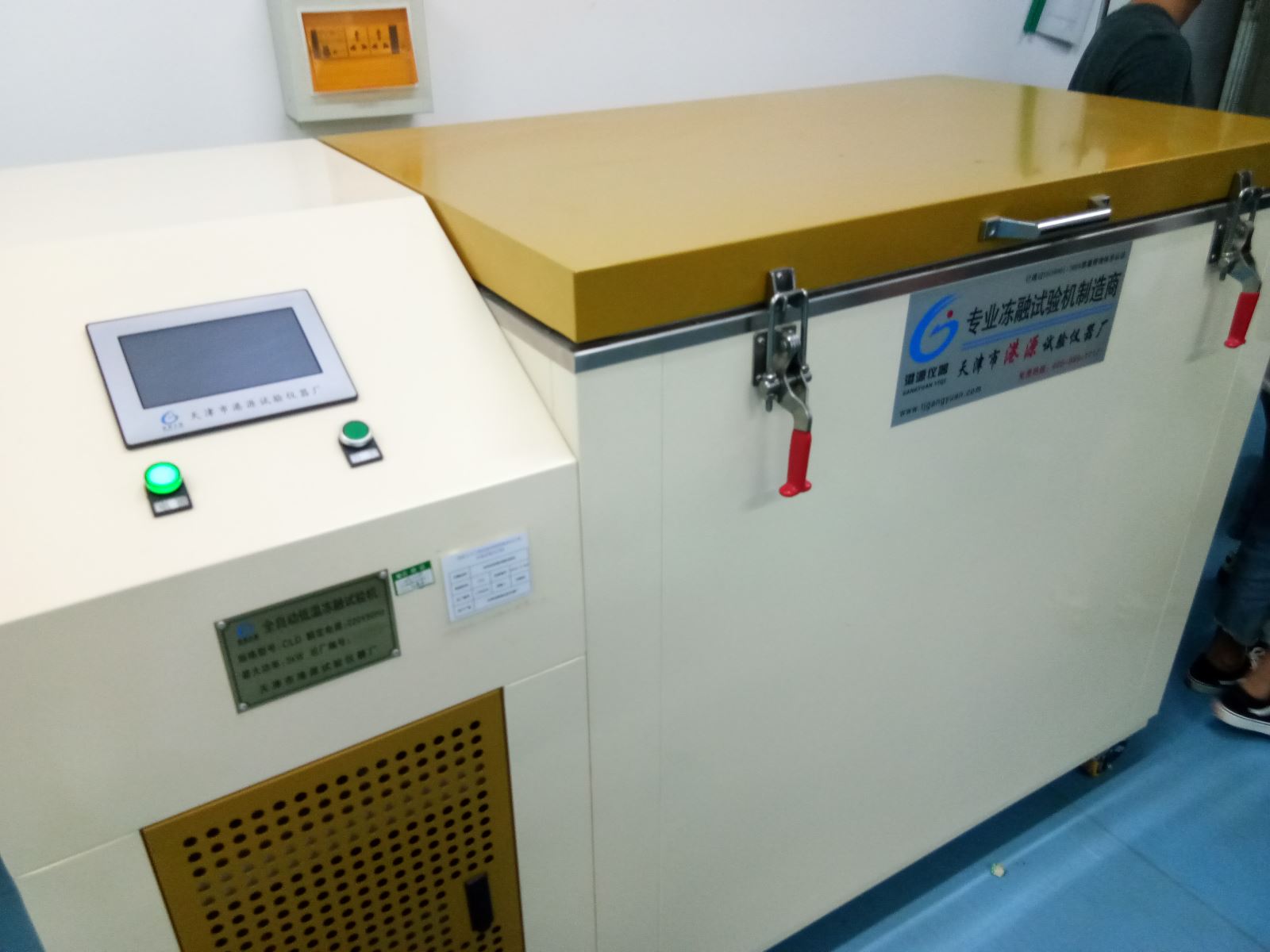 这是一台全自动低温冻融试验机,本设备采用立体结构,全部采用了优质钢材,内胆水箱和储水箱完全采用优质的不锈钢板,整体结构坚固,材料经过防锈处理,耐腐蚀性能好,主机采用进口全封闭制冷机组具有占地面积小使用方便和功耗小的优点。冷凝器是采用紫铜管制作,传热性能好。设备的启动、延时保持、停止都由仪表自动控制使用安全可靠。该设备具有高自动化、高效率、不进行任何调整和监视,自动完成0-999次冻融循环。