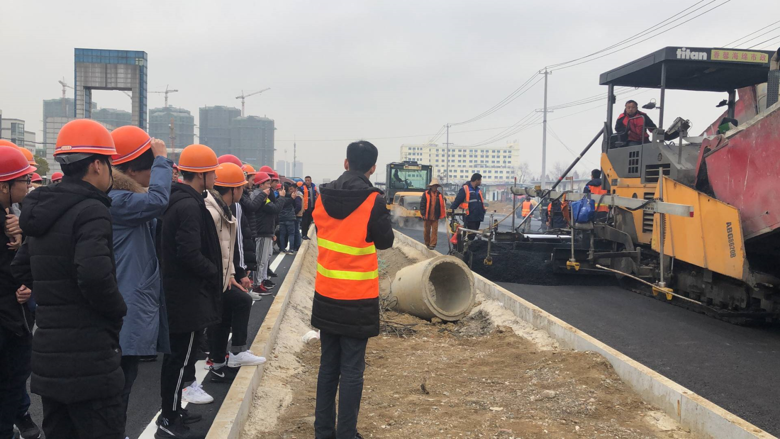 中午时分,学生们先参观了正在施工的合肥北城凤麟路区间道路。现场由力聚集团质量技术部栗部长为学生们做讲解。作为了加深同学们对沥青路面施工的理解认知,技术人员从道路等级、路面结构层、材料型号名称及设计与施工要求等方面做了形象生动的讲解与介绍,同时介绍了现场的机械设备名称、性能、原理及施工工艺流程。