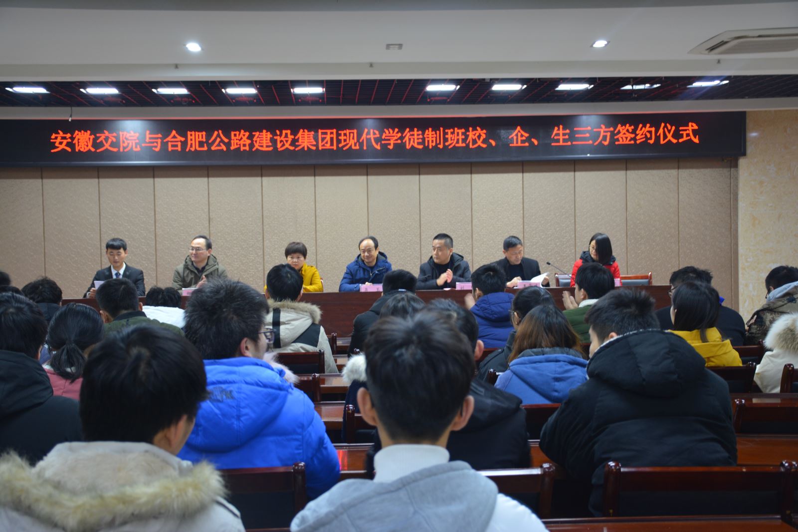 2019年1月5日上午9点整,18112班与合肥公路建设集团有限责任公司校、企、生三方协议签约仪式在学生处二楼大学生活动中心隆重举行。