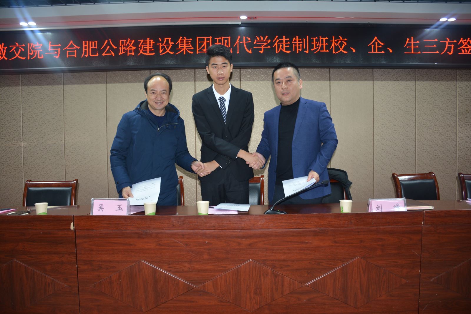 我们怀着激动人心的心情见证了学生时代有着深远影响的庄重仪式,全体同学共同见证了教务处吴玉处长,合肥路建集团刘峰副总经理,学生代表吴威的手紧紧握在一起的那一刻,我们知道,这握在一起的不仅仅是三人的手,更是校,企,生三方共同前进,共同发展的决心。