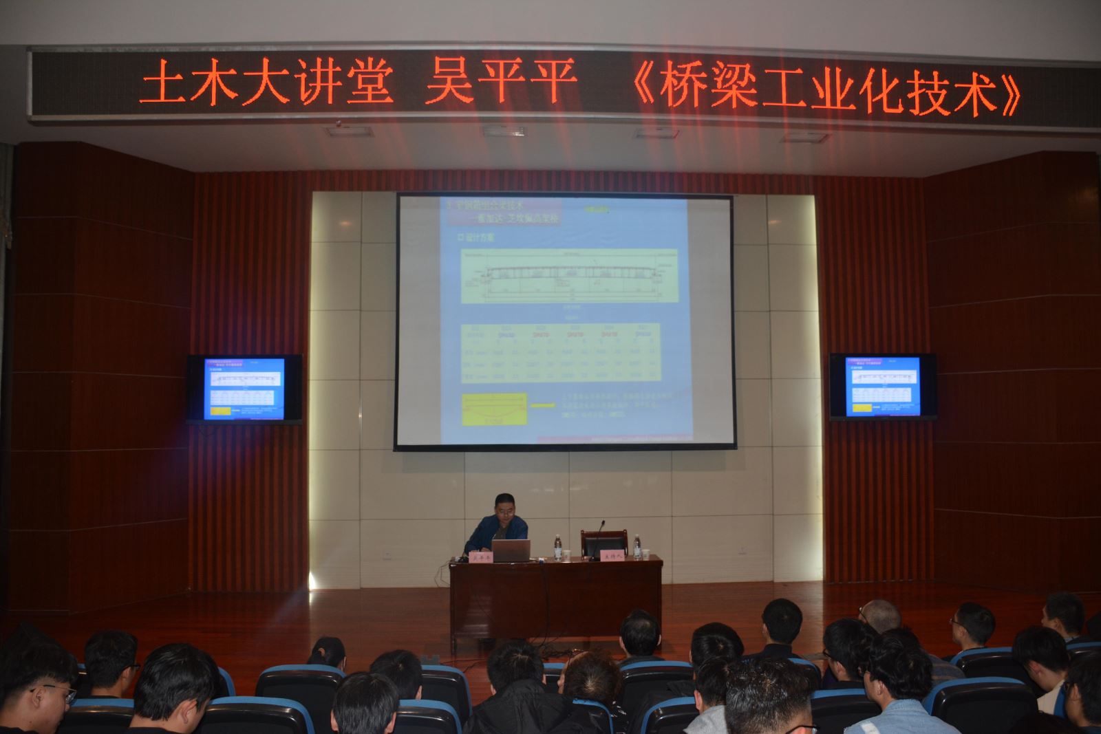 3月20日晚,土木工程系文化大讲堂在八角楼开讲。应我系邀请,安徽省规划设计研究总院股份有限公司工程技术研究院院长吴平平作题为“工业化桥梁建造技术”讲座及该公司数字三维设计研究所所长戴玮作题为“公路工程领域的BIM应用实践”讲座,会议由系书记邹建华主持,系17级学生和部分教师参加了讲座。