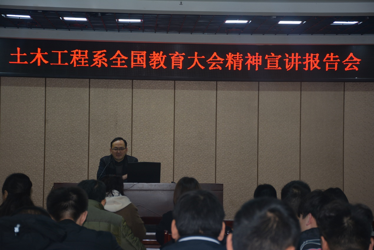 12月4日下午,土木工程系在大学生活动中心召开全国教育大会精神宣讲报告会,系党总支书记邹建华为我系教职工和学生代表作了题为“深入学习领会全国教育大会精神,切实做好我系教育教学各项工作”的报告。土木工程系全体教职工以及学生干部代表参会学习。
