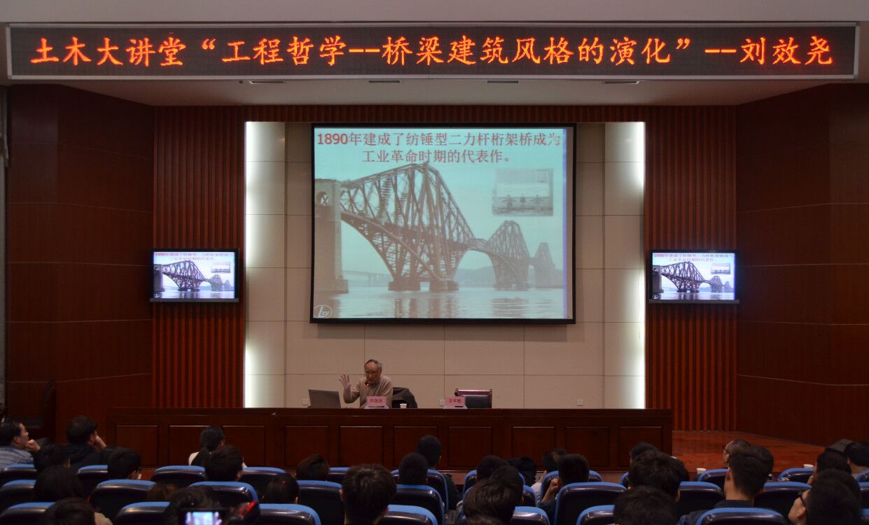 刘效尧教授首先从工程哲学的定义和内容谈起,接着又从建筑风格演化、桥梁风格演化、后现代桥梁风格、构成主义桥梁风格、中国桥梁风格演化、桥梁的消亡、桥梁的复活这七个方面为同学们进行了深度解读。通过展示的百余张图片,刘效尧教授从哲学方面分析了从公元2000年前到近现代各式各样的桥梁风格的演变,并引用达尔文的“生存下来的物种不是最强壮,也不是最聪明的,却是最适应改变的”理论希望同学们学会从哲学角度看待桥梁建筑风格的演化,要顺应社会发展的趋势,在桥梁行业做的好的不一定是名校,只有适应社会发展,才能取得成功。刘效尧教授对待专业、科研的精益求精、严谨细致的态度,让我们领略了“大国工匠”之风。