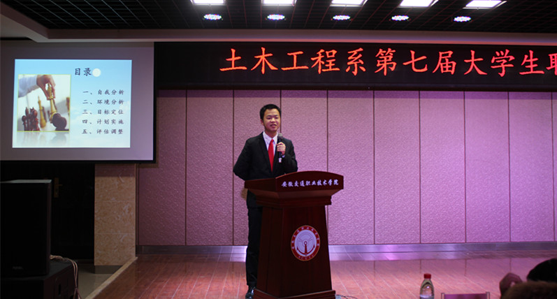 2016年1月6日晚7点,我系第七届大学生职业规划大赛决赛在院学生活动报告厅如期举行,合肥瑞德人力资源有限公司总经理郭忠会先生、安徽龙之域投资置业集团高级人力资源管理师金丹先生、院就业指导中心办公室华其娟主任、系团总支书记吕中国老师以及系就业指导老师何基荣等共同担任此次大赛的评委。