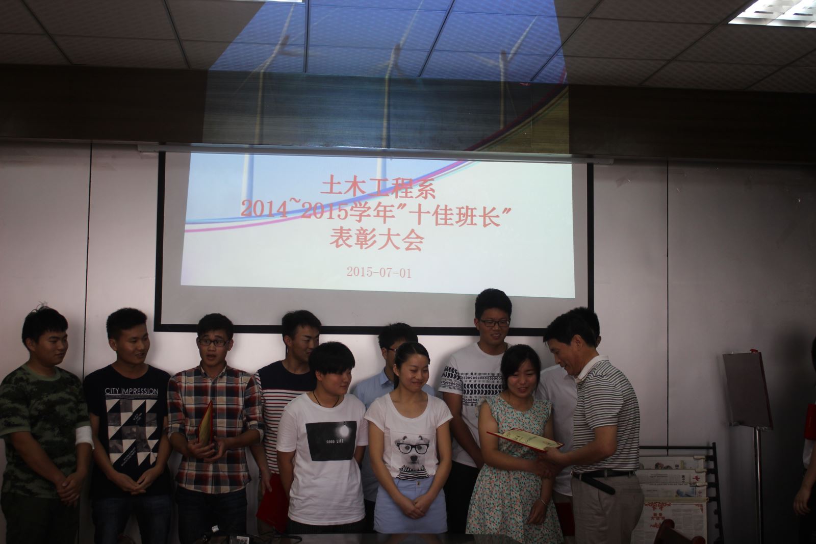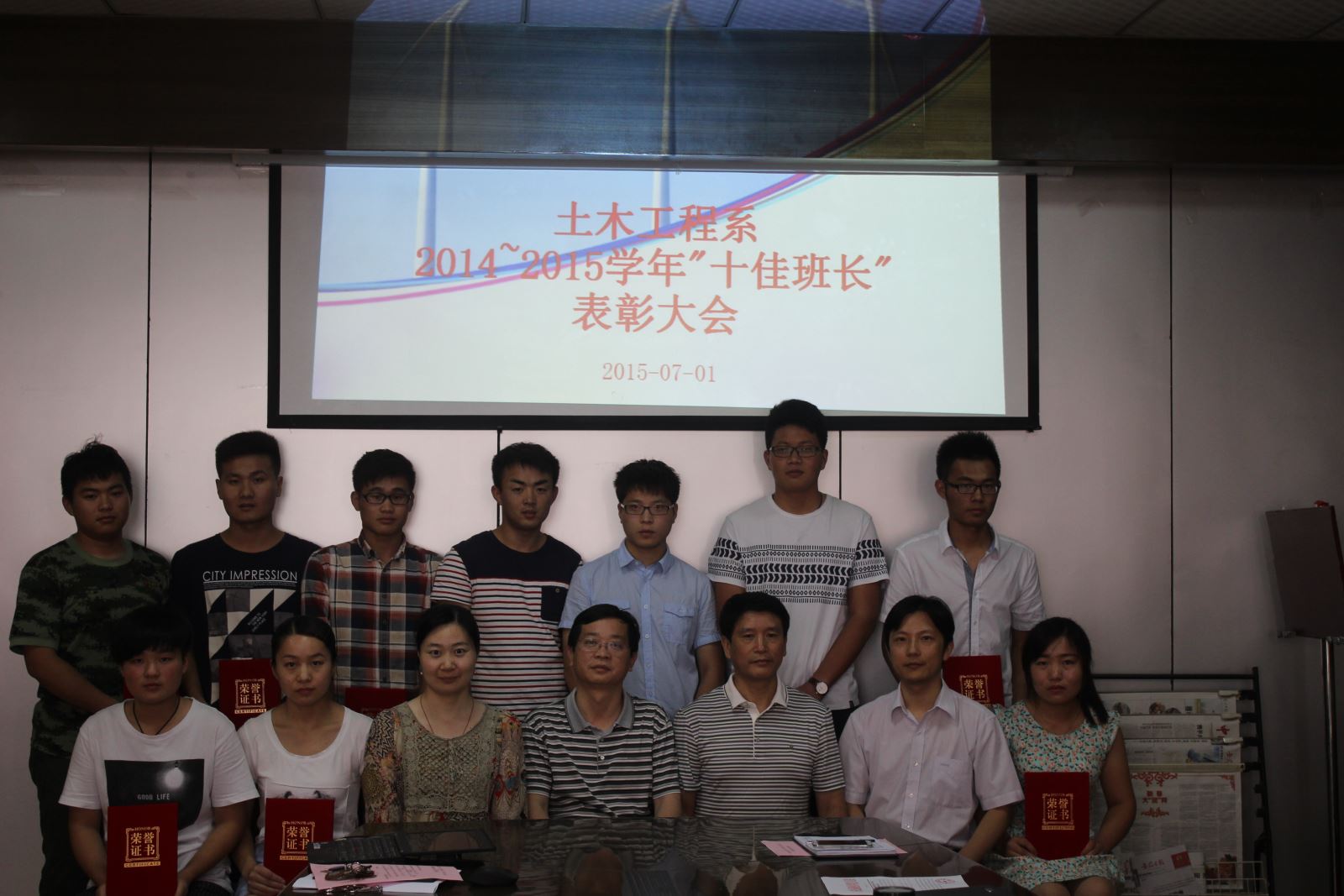 2015年7月1日下午四点半,土木工程系在会议室召开了2014-2015学年“十佳班长”表彰大会暨期末班长例会。系党总支朱文胜书记、陶权副书记、系教学秘书郭强老师、系主任辅导员赵婧老师以及13、14级各班长参加了会议,会议由赵婧老师主持。