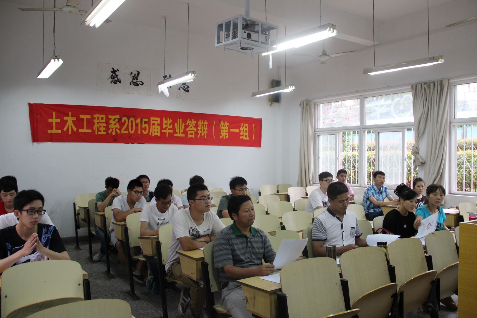 2015年6月26日,土木工程系2015届毕业答辩在教学楼顺利进行。本次答辩分为五个答辩组,分别由道路与铁道工程教研室王守胜主任、桥梁与隧道工程教研室严任苗主任、专业基础教研室齐永生主任、造价专业带头人杨敏老师、港口与建筑工程教研室徐炬平主任负责。每个班级随机抽取的部分毕业生参加了此次毕业答辩。
