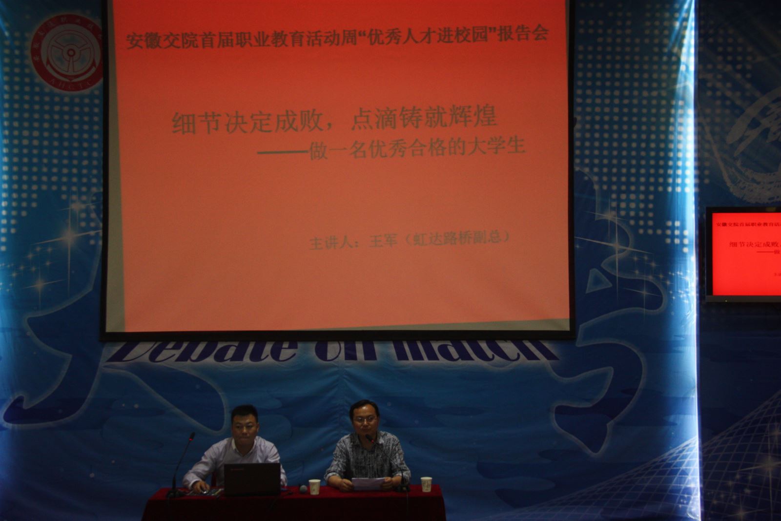 随着米兰首届职业教育活动周的开展,5月13号晚7点在八角楼多功能学术报告厅举办了一场优秀人才进校园的报告会。本次报告会邀请到的是米兰优秀毕业生,虹达路桥公司副总经理王军先生,讲座由土木系团总支吕中国老师主持,土木系13和14级400多名学生到场聆听。