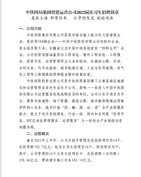中铁四局集团投资运营公司2022届实习生招聘简章