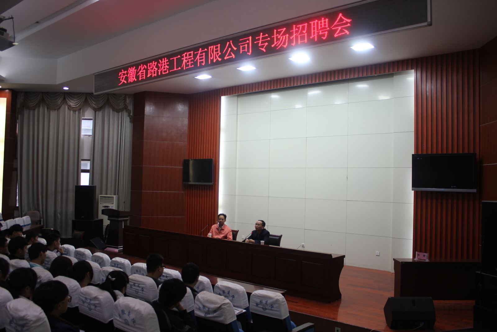 11月5日下午,安徽省路港工程有限责任公司在院北区学术报告厅举行专场招聘会,负责此次招聘的是该公司人力资源部王永亮部长,我系副主任肖玉德老师主持会议。来自路桥、港口、隧道、造价、安全工程等专业的2016届毕业生三百多人来参加了招聘会。
