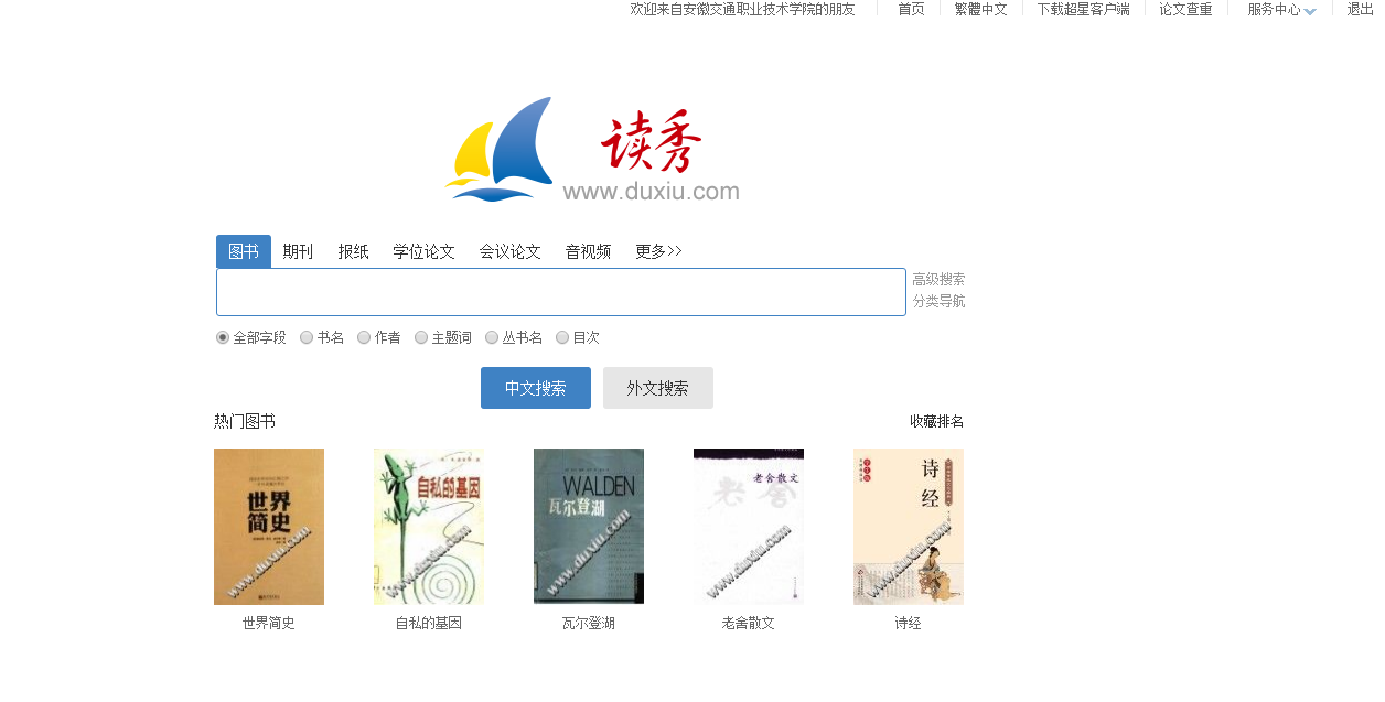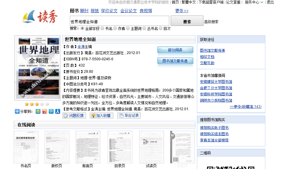 整合服务:整合了我馆的馆藏检索系统,读者可以很方便地了解哪些图书我馆有收藏,提高了查询、借阅图书的效率。此外,还提供获取该图书的各种渠道,可直接链接到出版社、网上书店及其他收藏单位,方便读者购买或借阅。经与本馆管理系统相配合,读者可通过读秀对本馆纸本馆藏图书及已购买的电子图书进行查询。