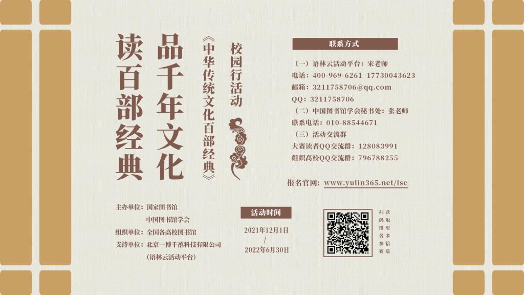 由国家图书馆、中国图书馆学会主办的“读百部经典 品千年文化”——《中华传统文化百部经典》校园行活动即将开展,欢迎米兰师生读者积极报名参与。本次活动将由《百部经典》阅读打卡、“经典有声”原著诵读展示、“共享悦读”微书评荐书推广、“百部经典?百题大闯关”传统文化知识竞赛等四部分组成。