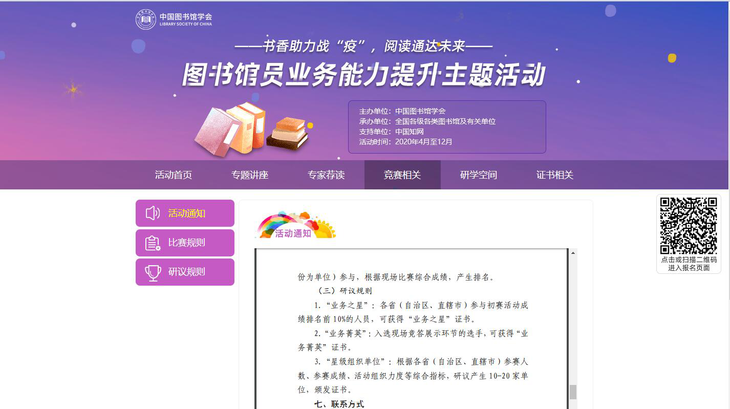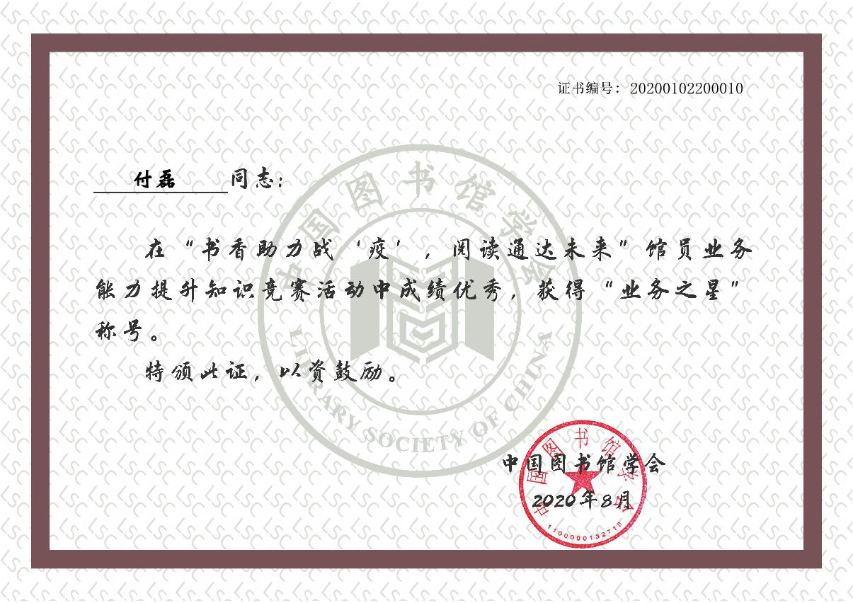 中国图书馆学会为助力疫情之后各馆阅读推广工作开展, 全面提升馆员业务能力,促进新环境下文化服务整体水平,于2020年上半年开展“书香助力战疫,阅读通达未来”—图书馆员业务能力提升主题活动。主要由专题讲座、专家荐读、馆员业务能力提升知识竞赛组成。我馆积极组织馆员参加,付磊老师在馆员业务能力提升知识竞赛中以98分、安徽省第二的成绩获得“业务之星”称号。