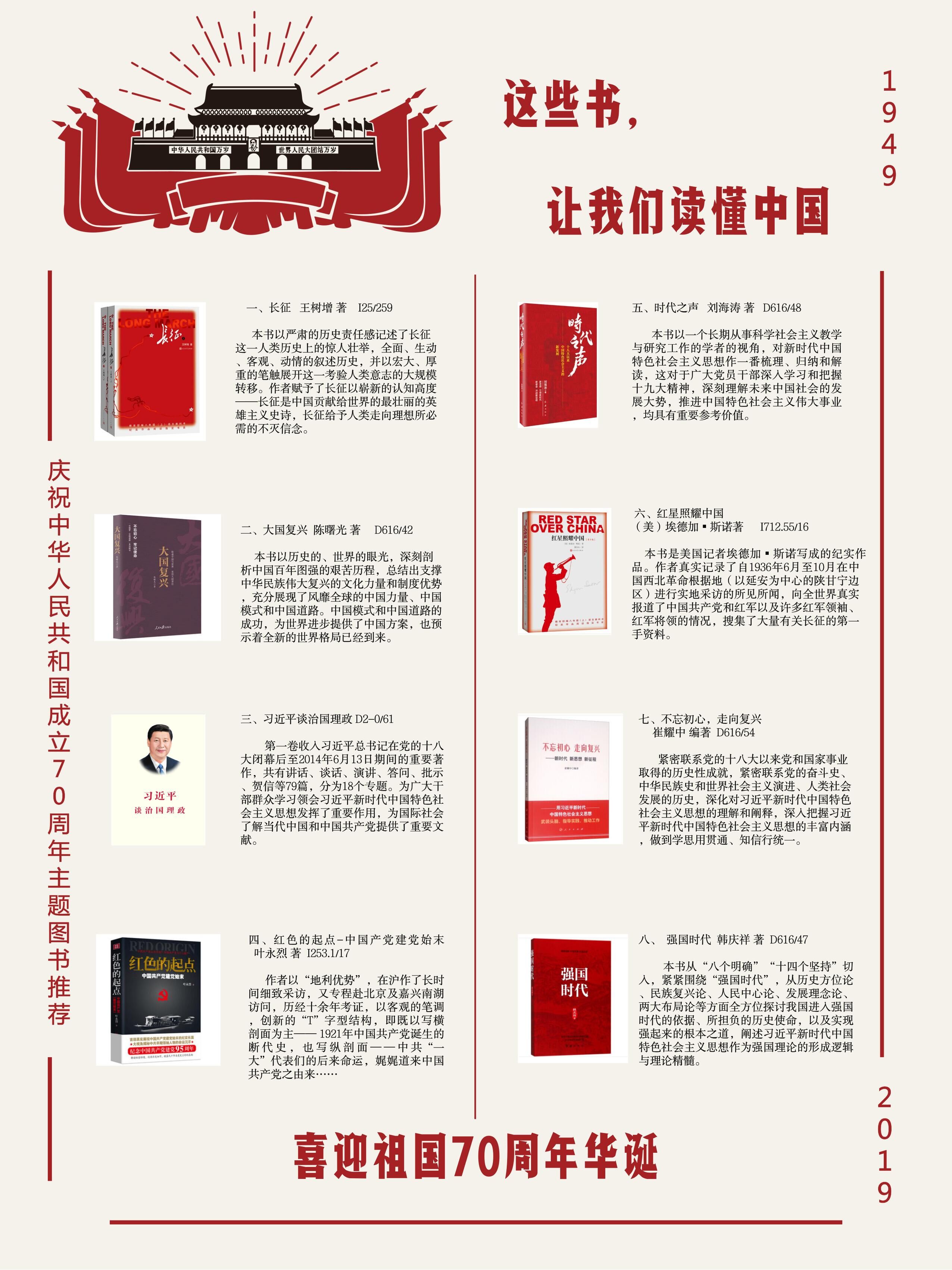 9月23日上午,图书馆党支部全体党员在二楼党员活动室开展党日活动。大家畅所欲言,最终形成统一意见——围绕中华人民共和国成立70周年主题开展图书推荐。党员同志积极进行红色书籍推荐,从馆藏文献资料中精心挑选了一批富有思想性、教育性、吸引力、感染力、讴歌辉煌历史、弘扬革命传统、培育民族精神的图书,最终形成了推荐一份推荐书单,包括《长征》、《大国复兴》、《习近平谈治国理政》、《红色的起点——中国共产党建党始末》、《时代之声》、《红星照耀中国》、《不忘初心,走向复兴》、《强国时代》等。这些图书内容展示了新中国成立以来党对国家的治国理念随着社会发展阶段不同的转变,以及社会经济的飞跃式发展、大国文化的传承。最终书单已经进行海报设计,制作成展板在图书馆大厅展示。