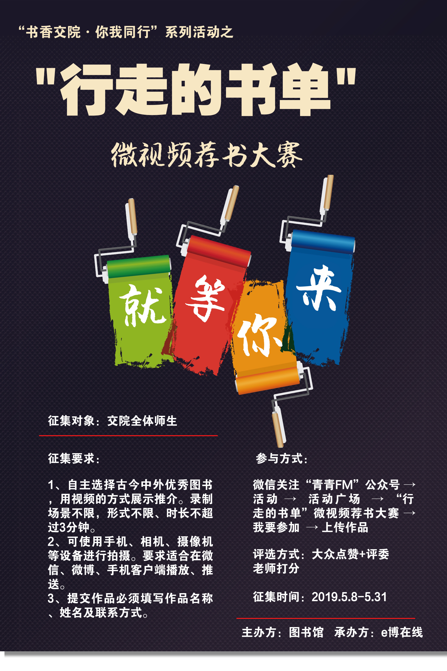 每个时期,每个高校,每个学子都有自己的读书风格,我们想将大学生手中的书籍串联起来,在高校学生群体中形成一个“行走的书单”,通过微视频的形式,来听你介绍并品评自己推荐的图书——加入我们,让我们听到你对阅读的图书所进行的思考和观点的表达吧。