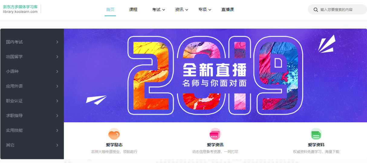 登录本校图书馆网站主页——点击“新东方多媒体学习库”或电脑端登录“library.koolearn.com”直接访问