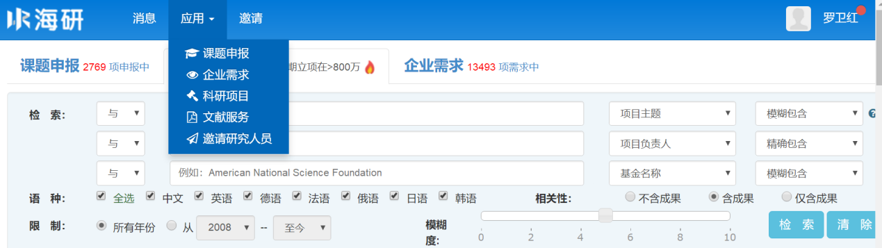 其中,“科研项目”主要应用为助力青年科研学者科研项目申报。青年科研学者作为“海研”主要用户群体,在科研创新和成果转化中发挥着重要的作用。“海研”通过以下几点应用促进青年科研学者更加科学的、高效的进行科学研究。