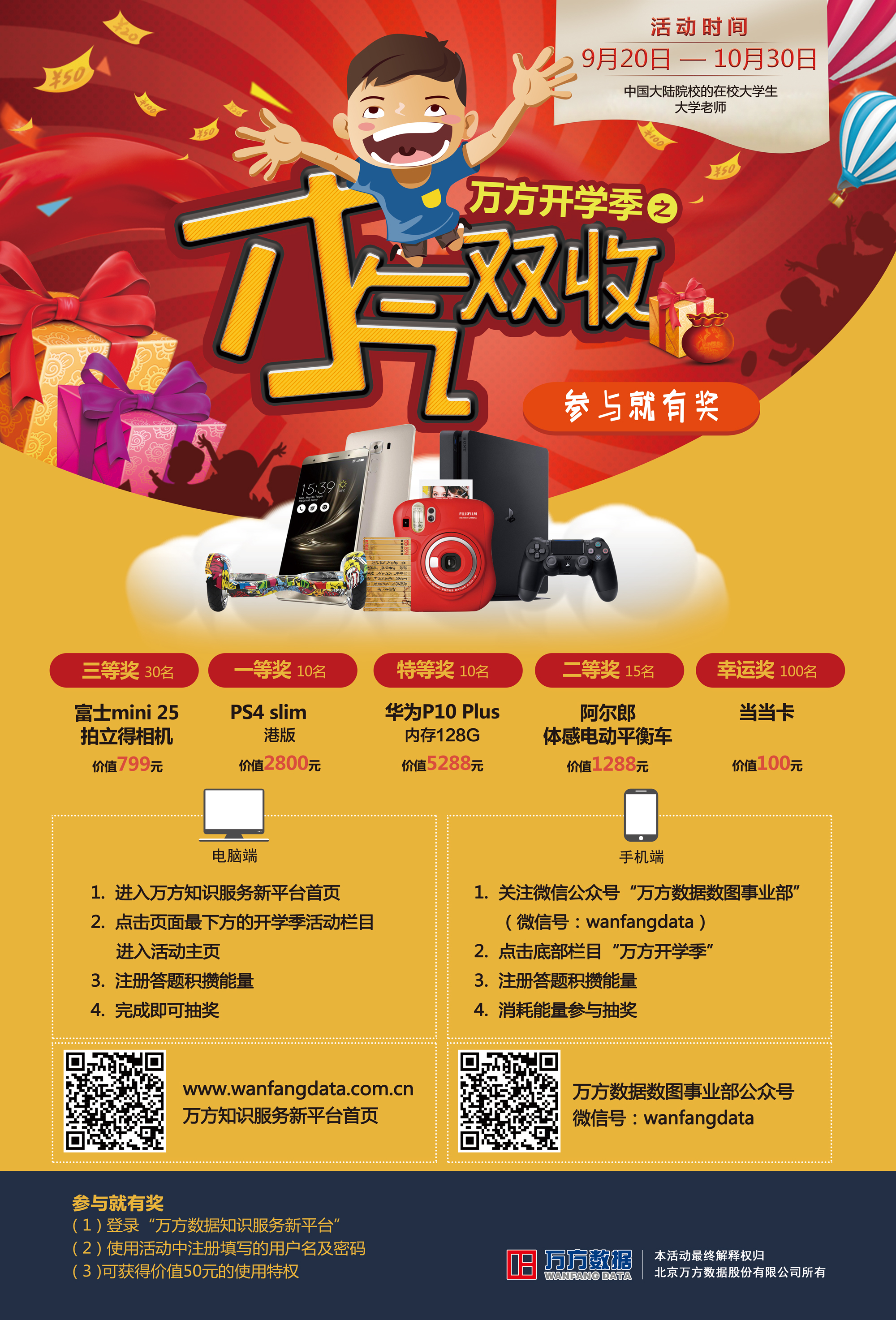 手机端:关注微信公众号“万方数据数图事业部”(wanfangdata),点击底部栏目“最新活动——万方开学季”,进入活动主页,注册参与答题。