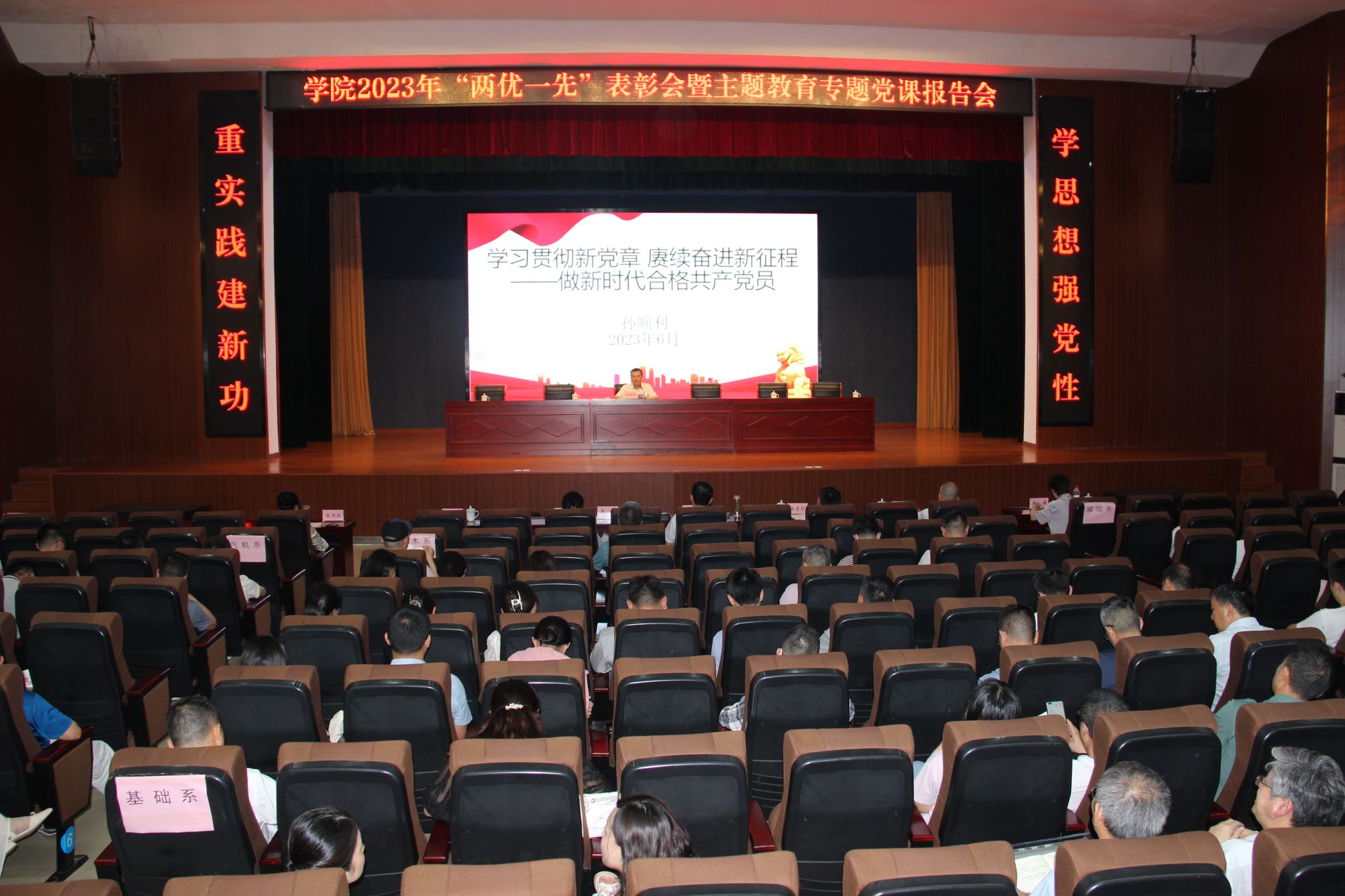 ?为热烈庆祝中国共产党成立102周年,6月28日,学院召开2023年“两优一先”表彰会暨主题教育专题党课报告会。厅政法处四级调研员李倩到会指导,院党委书记孙顺利围绕“四个讲清楚”,以“学习贯彻新党章 赓续奋进新征程——做新时代合格共产党员”为主题作党课报告。院党委副书记、院长孙晓雷主持会议。