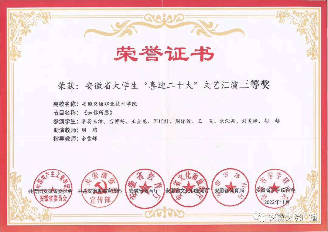 自5月以来,安徽省大学生“喜迎二十大”文艺汇演评选从全省高校推报的206件文艺作品中评出103件作品入围终选。经过激烈的角逐,米兰情景剧《最可爱的人》荣获语言表演类一等奖,歌伴情景《如你所愿》荣获声乐类三等奖。