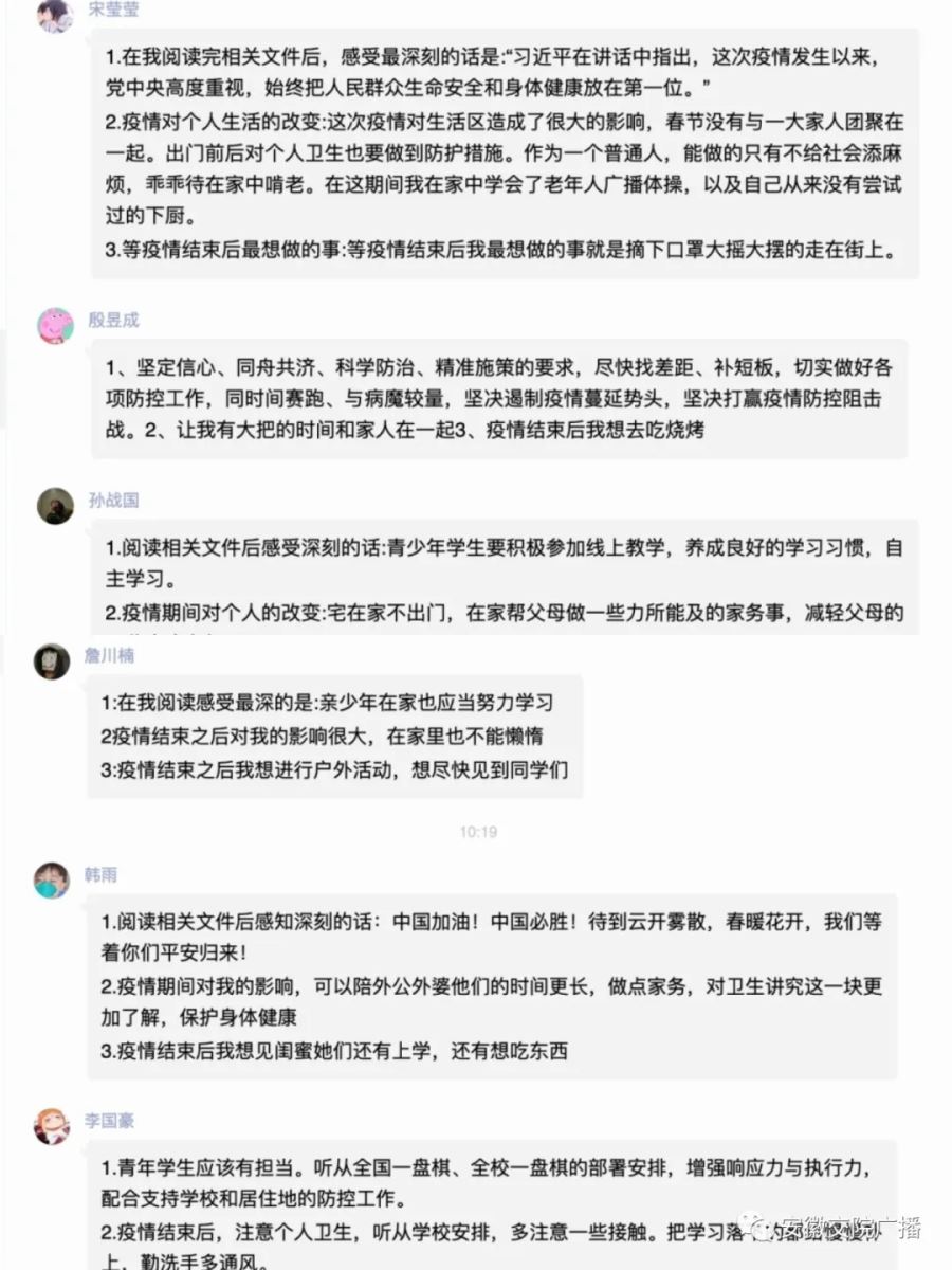 由各团支部通过班级群组织开展,宣传防疫知识,解读防疫形势,疏导恐慌焦虑心理。