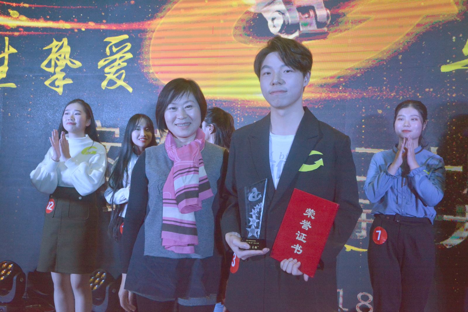 两轮比赛结束后,四位历届大赛冠军深情演绎了主题朗诵《此生挚爱 与声聚来》,带大家回顾了“广播之夜”主持人大赛的风雨二十年。之后,由程祺主唱的乐队为我们带来了歌曲《活着》,寓意交院学子未来可期。比赛现场范仲涛认真做了点评,肯定了交院广播取得的成绩,以及选手们的精彩表现,并宣布比赛结果。管理系获得本届闪亮星主播冯暕,汽机系朱昊哲获得“最佳人气奖”,安徽音乐广播总监安妮和学生处处长喻谨分别为获奖者颁奖。
