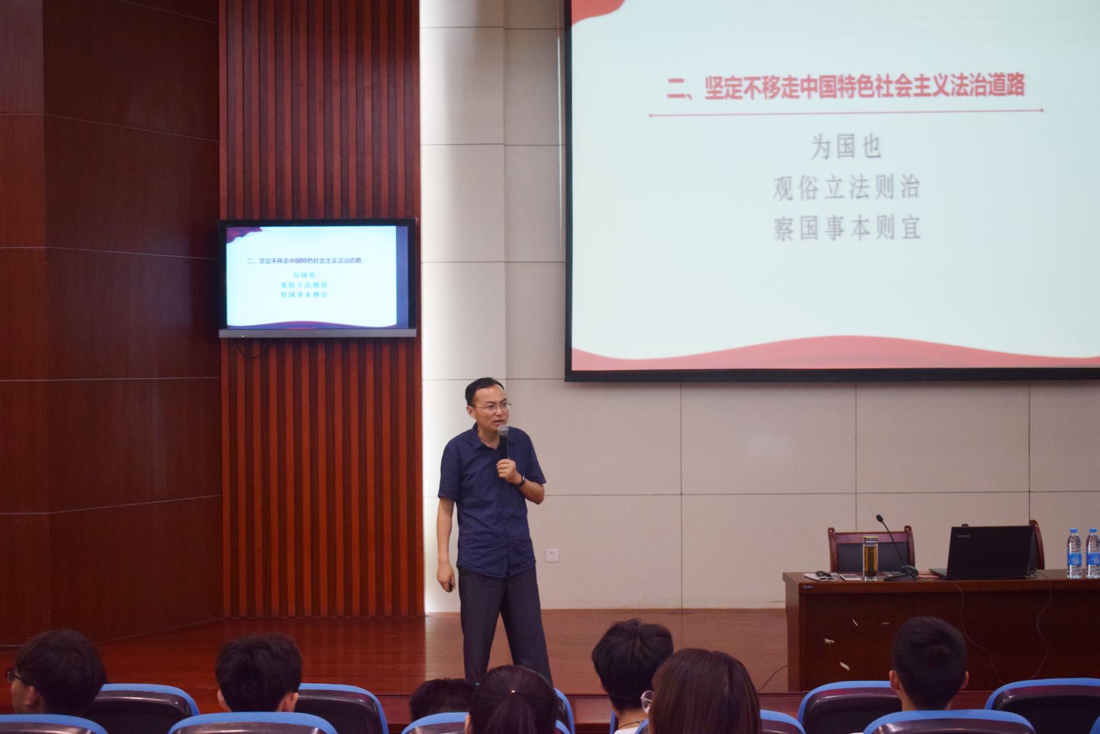 开班典礼后的首次讲座由文理系副主任,党总支副书记吕中国老师主讲,吕老师在综述“习近平新时代中国特色社会主义思想三十讲”主要内容的基础上择取了第十七讲“加快建设社会主义法治国家”为题,围绕“推进全面依法治国的总目标”、“如何建设中国特色社会主义法治体系”、“党的领导是中国特色社会主义法治之魂”等方面进行了详细的讲述,讲座过程中,不时穿插互动,学员们积极参与,取得了较好的效果。
