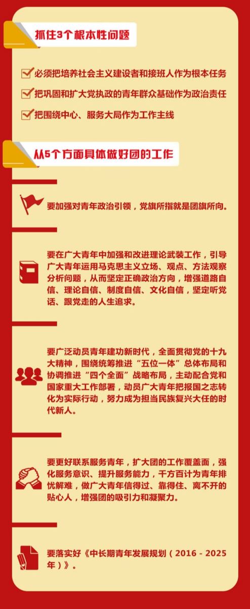 抓牢根本任务,共青团要致力培养中国特色社会主义事业合格建设者和可靠接班人。传承、引导、塑造,是青年工作的主题词。“形体其身,精神其心”,每个国家都是按照自己的政治要求来培养人的。共青团就是要用党的理论和路线方针政策、用社会主义核心价值观来引领青年思想,帮助青年坚定理想信念,坚定传承红色基因和中华优秀传统文化,成长为担当民族复兴大任的时代新人。要大力加强和改进青年理论武装工作,引导广大青年运用马克思主义立场、观点、方法观察分析问题,尤其要深入推进“青年大学习”行动,引导青年用习近平新时代中国特色社会主义思想构筑强大精神支柱,切实增强“四个意识”,坚定听党话、跟党走的人生追求。要加强中国梦宣传教育,加强近代史、党史和国情政策教育,让青年深刻把握历史经验,深刻认识现实成就,大力增强“四个自信”。要深入开展社会主义核心价值观培育践行,让广大青少年扣好人生第一粒扣子,用青春活力为中国精神、中国价值、中国力量增光添彩。