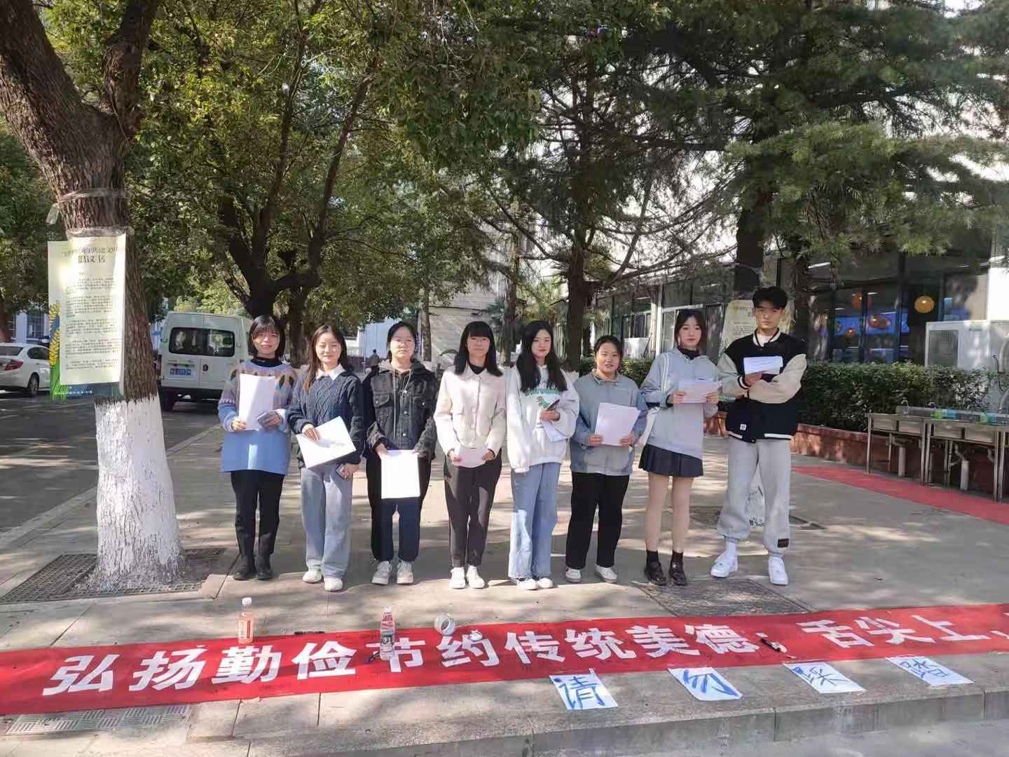 11月13日,文理科学系于北区食堂门口举办“我的光盘行动承诺书签名活动”,号召全校师生投入到节约粮食、反对浪费的实际行动中去,从自身做起,从细微处做起,将勤俭节约铭刻于心,付诸行动,把勤俭节约落实到生活中的每个细节,以此传承中华民族勤俭节约的优良传统。