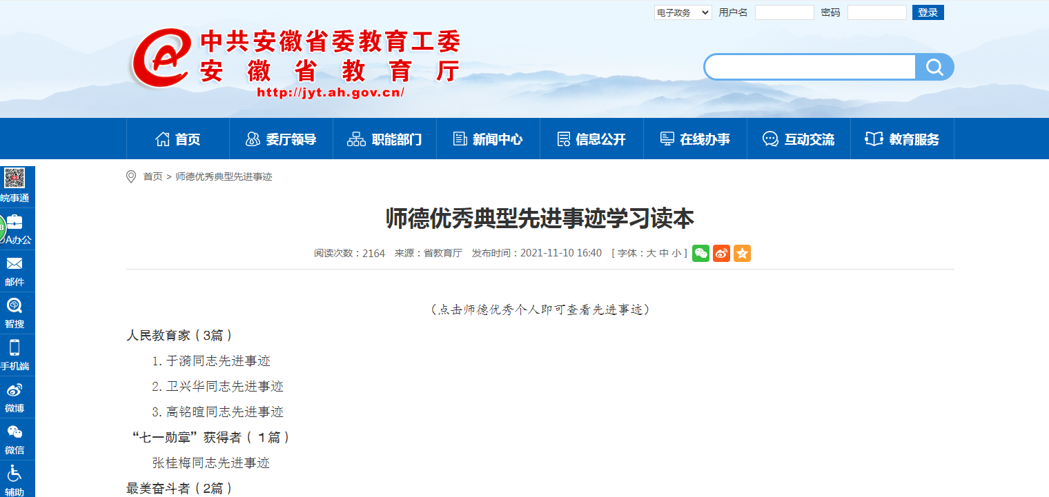 师德优秀典型先进事迹学习读本,链接:http://jyt.ah.gov.cn/ztzl/sdsfjyzl/sdyxdxxjsj/40486496.html