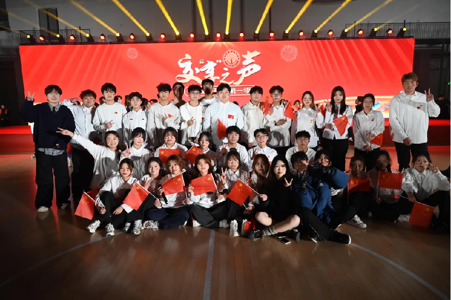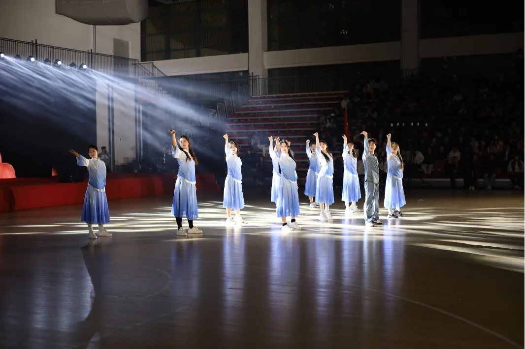 公开课第三部分名为“追梦的青春”。思政课老师深情地讲述着:中华民族在一代代青年的接续奋斗中,从站起来,到富起来,再到强起来,不仅洗掉了“东亚病夫”的耻辱,而且可以自豪地平视这个世界!精彩的“奥运集锦”视频片段,让大家深切感受到了从一个人的奥运,到十四亿人的奥运,中华民族实现了蜕变!艺术团同学们的情景舞蹈表演《有我》,让我们看到了青年的担当,为我们呈现出一幅现代中国的盛世辉煌。在公开课的最后环节,思政课老师们带领同学们回望过去、展望未来,全场师生同唱《我爱你中国》,高呼“无奋斗,不青春”,师生手中挥舞着国旗,将思政课现场点燃成了一片红色的海洋!