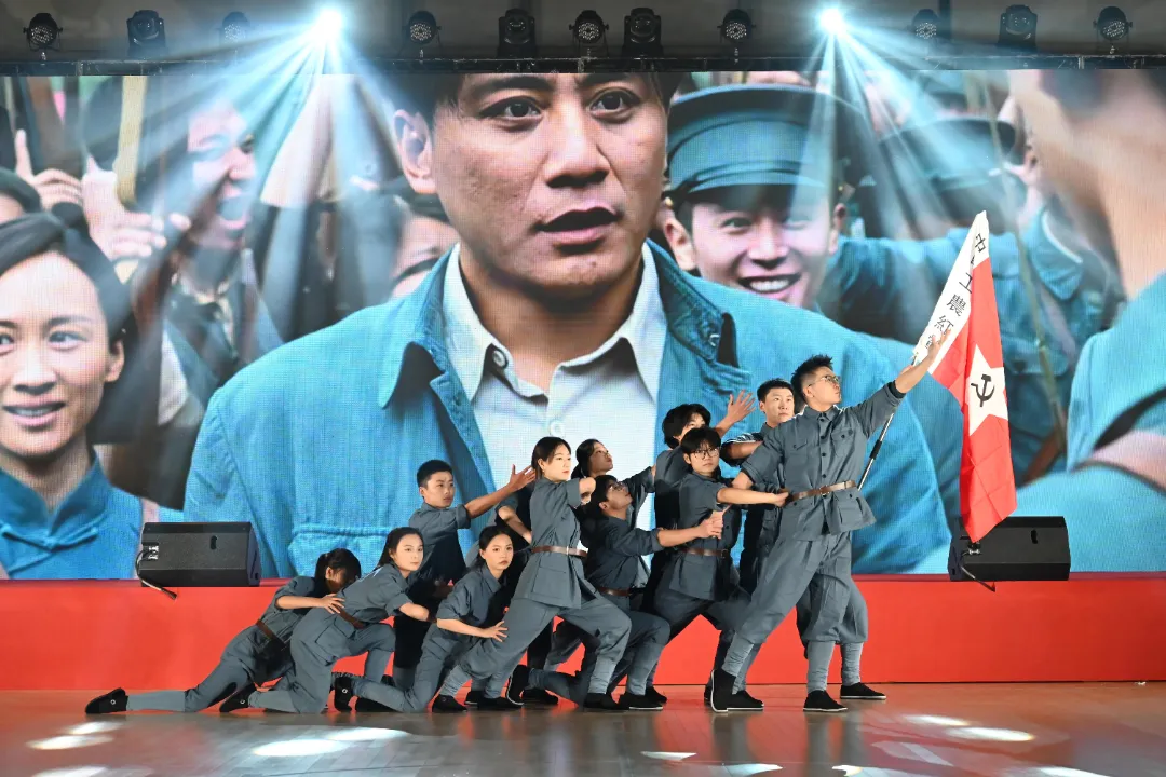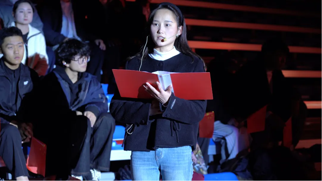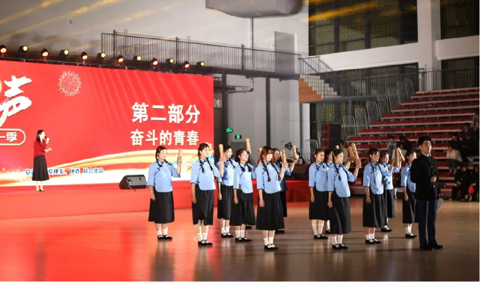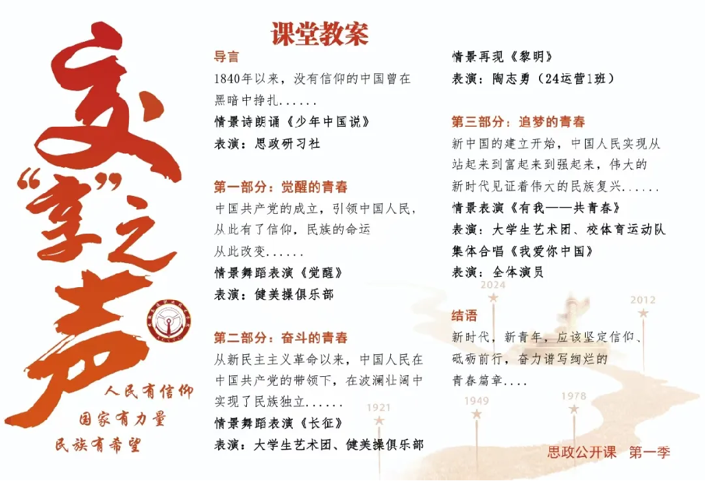 公开课第二部分名为“奋斗的青春”。思政课老师们讲述了奥运健儿刘长春“单刀赴会”、出征第十届洛杉矶奥运会的情景,描述了年轻红军战士用坚强和毅力赢得了中国革命征程上两万五千里“马拉松”的壮举。情景表演《长征》以精湛的艺术手法再现了长征的壮丽史诗,激昂壮阔的音乐与刚劲有力的舞蹈动作完美结合,演员们的表演充满激情,将观众带入了那段波澜壮阔的历史。在思政课老师娓娓道来的讲述中,情景表演《黎明》生动演绎了牢狱中方志敏的宁死不屈,而他写下的《可爱的中国》——描绘了未来中国革命的光明前景,再次直击师生们的内心。