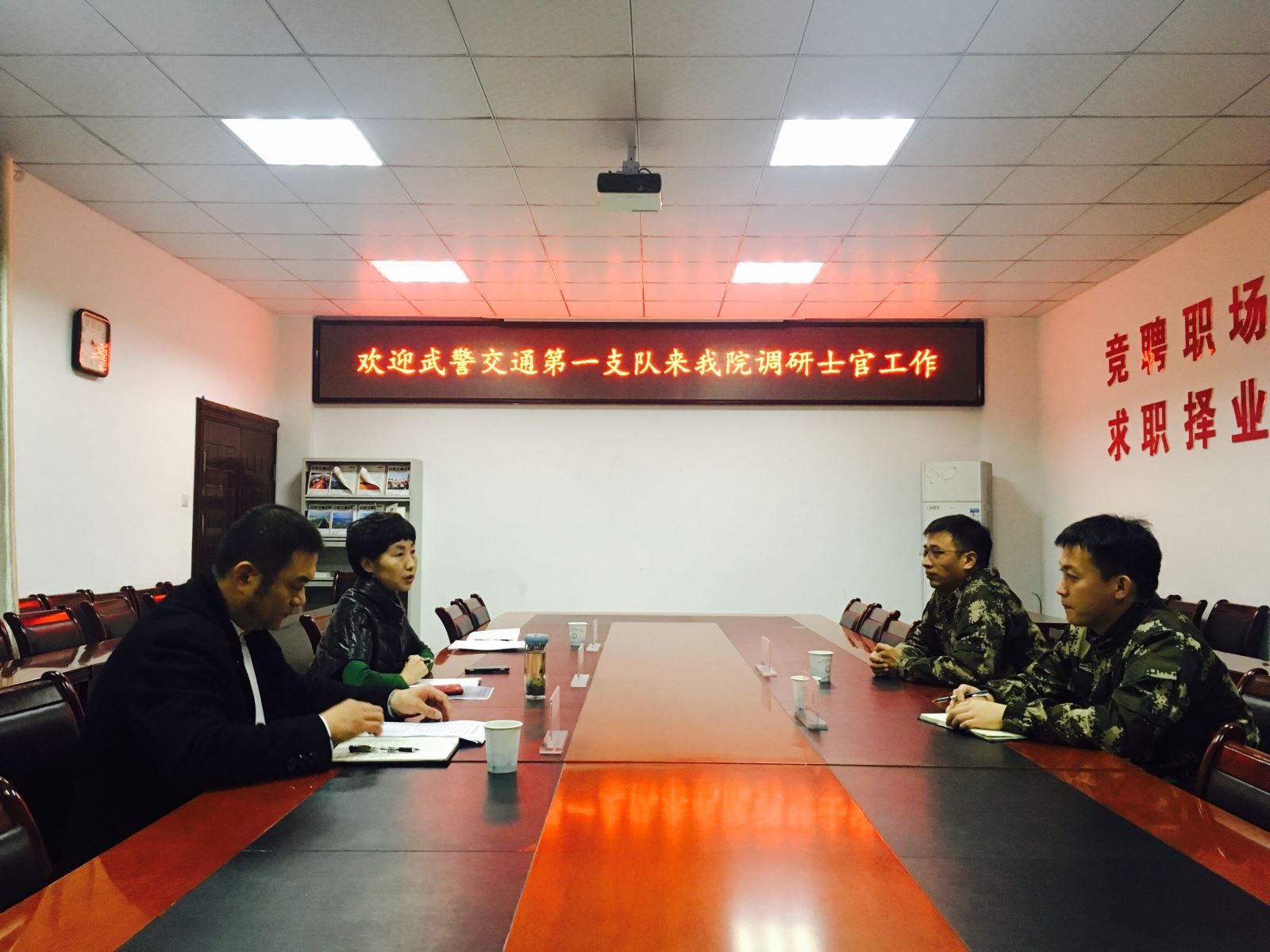 12月3日下午,武警交通第一支队人力资源科科长周毅一行到米兰调研定向培养直招士官工作,学生处处长喻谨、副处长徐刚参加了调研。