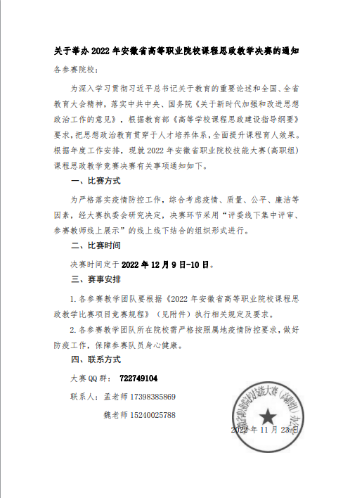关于举办2022年安徽省高等职业院校课程思政教学竞赛的通知