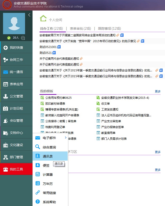 为方便各位同事查看校内其他同事的通信方式,在OA中加入了“通讯录”,如个人的通信方式有变的话,请及时更改,以便大家联系。