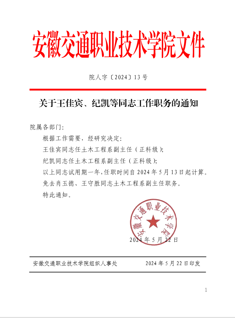 关于王佳宾、纪凯等同志工作职务的通知