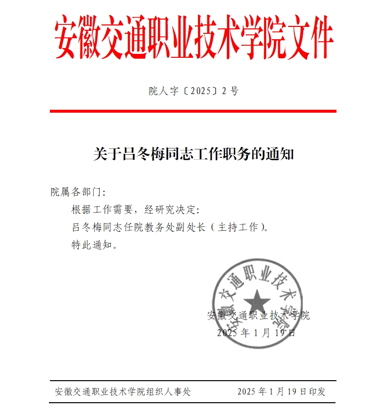 关于吕冬梅同志工作职务的通知