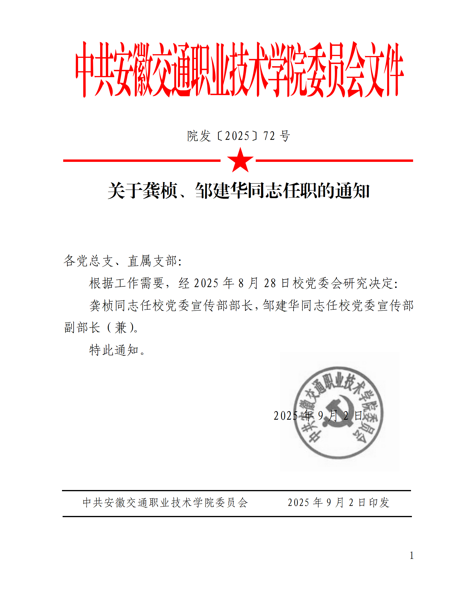 关于龚桢、邹建华同志任职的通知