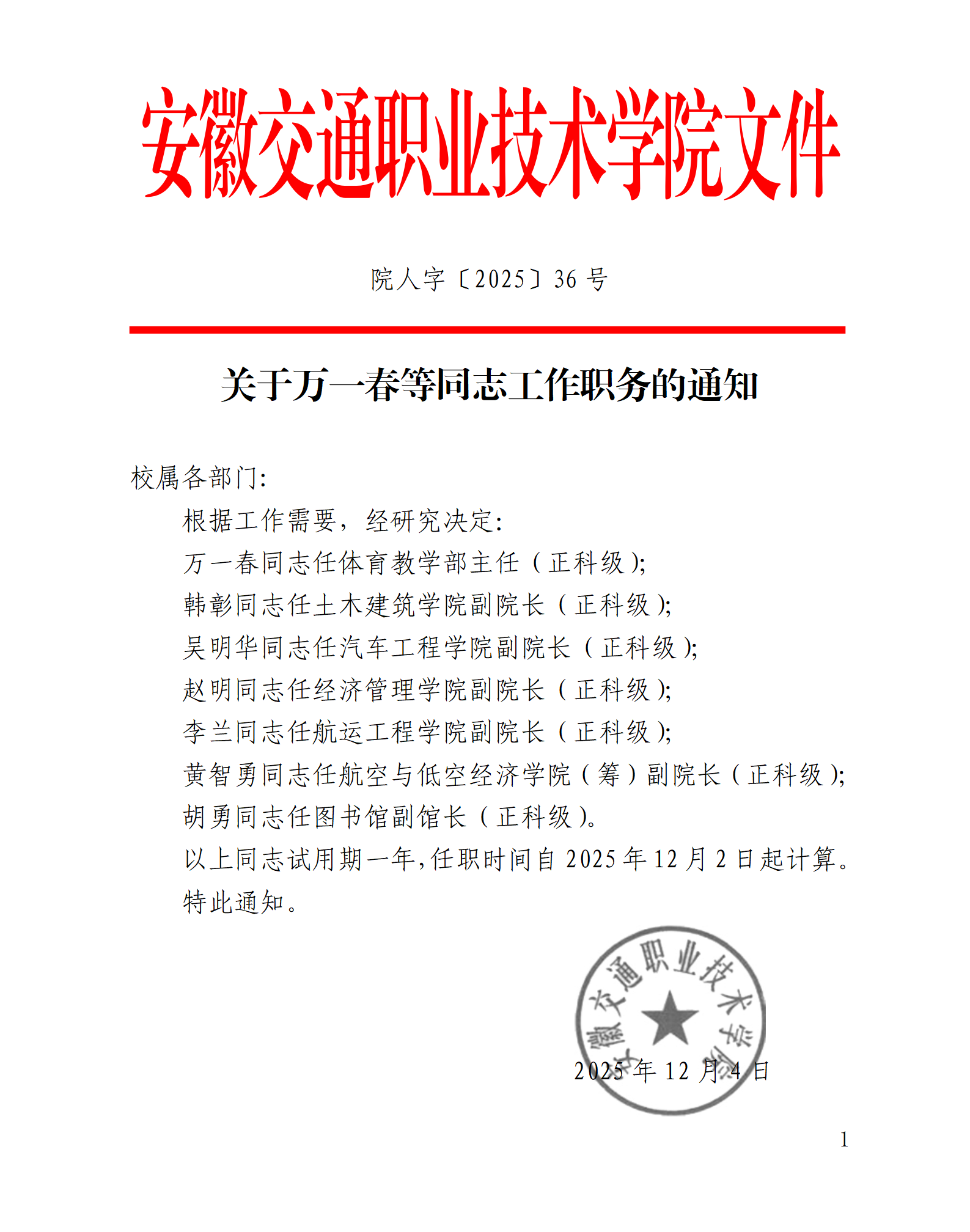 关于万一春等同志工作职务的通知
