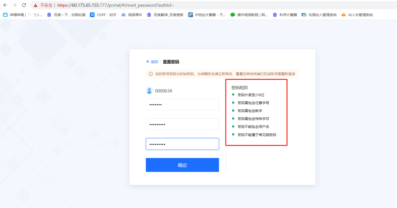 4、第二步会提示修改一个强密码(为了安全考虑)按下图红框提示进行修改,点击确定进去系统。修改后的密码请各位老师记录并保存