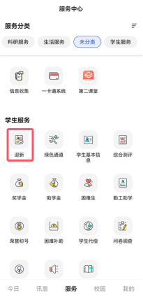 2、今日校园服务内往下滑进入学生服务分类内,点击迎新进入使用