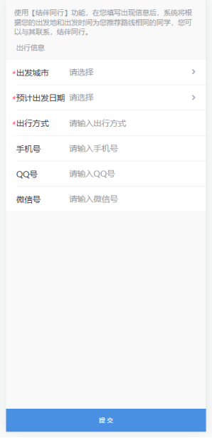 结伴同行:在填写出现信息后,系统将根据您的出发地和出发时间为您推荐路线相同的同学,您可以与其联系,结伴同行。