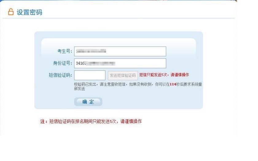 输入考生号,身份证号,点击“发送短信验证码”按钮后,系统会随机发送6位数字验证码至考生报名时所填的手机号上;填写完短信验证码,点击“确定”,跳转至考生修改密码页面,设置考生登录密码。短信验证码只能发送5次,请考生谨慎操作。