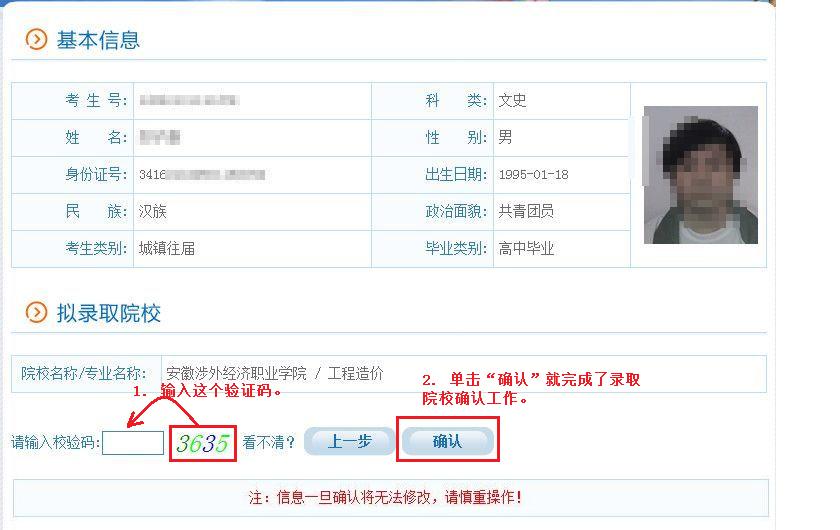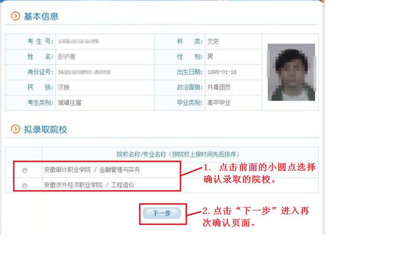 2. 用自己设定的密码重新登录,进入录取院校确认界面: