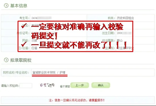 2. 用自己设定的密码重新登录,进入录取院校确认界面(示例):