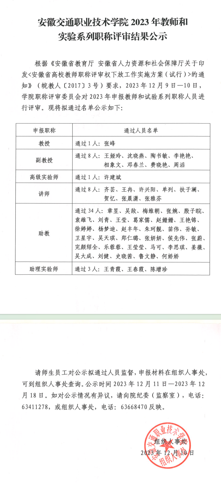 米兰milan官方网站2023年教师和实验系列职称评审结果公示